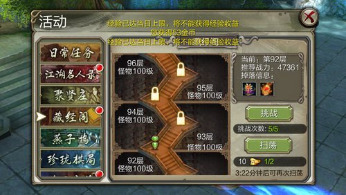 《天龍八部3D》中最能體現技術和戰力的便是藏經閣,也被玩家簡稱為爬塔,層數越高帶來的收益就越高,玩家之間戰力拉開間隔也是靠這個,究竟遊戲中獲取強化資源以及金幣的途徑不多。