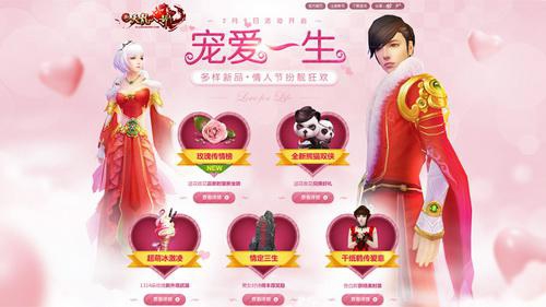 【玫瑰传情:秀恩爱赢新装】      明日就是情人节了,约会大作战的方案想好了吗?      让新天龙为你提供一个挑选:2015年2月15日活动结束前,在游戏中赠送玫瑰花或收到玫瑰花,参与“耀世传情榜”和“万千宠爱榜”的比赛吧!终究每个服务器两种排行榜前3名的玩家,可取得男性坐骑【水碧飞鸢】或女性坐骑【绛紫飞鸢】,以及新武器外形【樱桃布丁】、永久专属称谓等奖赏。情人节当日,每个服务器赠送玫瑰花最多的玩家,还能额外取得永久新时装【龙凤呈祥】2件,并且能够染出稀有色哦!      送花的同时,还可取得道具,用于兑换珍兽笼【熊猫双侠】、时装点缀道具【蜜语金丝】等等,把爱意和自己姓名一同,缝到心上人的新装上,让真爱永撒播。当然,如果你为异性送上限定版1314朵玫瑰花的话,还有特别惊喜--新武器外观【草莓甜筒】送给你和TA!      【情定三生:秀才艺拿大奖】      2015年2月22日之前,玩家能够从洛阳邱碧特处接取使命,带上心仪的异性找到三生石,互相合作把空白的卷轴上的情诗填满,将才艺考校一番!只需你们心意相通,完美完成应战,就会取得三生石的爱情祝福,享用属于你们二人的美好时刻。值得一提的是,活动中可取得新融魂丹【锦鳞】、坐骑【银河灵鹊】和各种各样的子女时装,这下不只自己有新衣穿,子女们也有新衣服啦!      【千鹤寄情:秀告白开福袋】