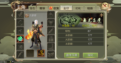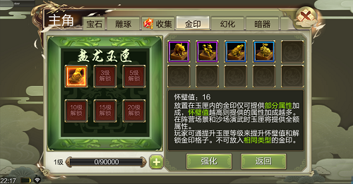 主要影響放置在盤龍玉匣內的金印的特點加成,俠士能夠經過註入人物經歷或運用【篆刻心經】來提高盤龍玉匣等級,盤龍玉匣等級越高則懷璧值越高,懷璧值越高則特點加成越多。      想必俠士們最為關心的,就是金印的獲取方法了~新資料片更新後,當俠士集齊某壹種金印碎片後,可在乾坤袋中進行合成;而剩余的金印碎片可在混元囊中提煉為【金晶】。