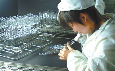 工作人员正在检查镜片质量。